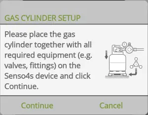 Finally, place your gas cylinder and all the necessary equipment (hose, valves, etc.) on the Senso4s device – please confirm that the total additional mass does not exceed 2,5 kg. Once done, tap Continue. If all the steps were done correctly, you should see the first measurement.