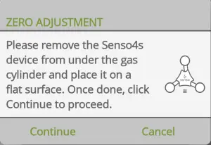 Remove everything from your Senso4s device and place it on a flat surface, then tap Continue to perform the zero adjustment, which ensures the measurements are within the measuring accuracy.