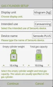 Select preferred display unit (kilogram or pound) and intended use (for illustrative purposes only), name your Senso4s device and fill in the Empty cylinder weight and Total gas capacity values. Both values are displayed on your gas cylinder – empty cylinder weight is most often embossed or stamped on the cylinder itself, whereas the total gas capacity is usually shown on a sticker attached to the cylinder. Do not put your gas cylinder on your Senso4s device yet. Once done, tap Continue.